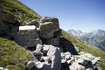 Proseguendo il sentiero oltre l' ingresso del centro 1 bis, si giunge ad un centro molto ampio, con malloppi disposti circolarmente attorno ad un ricovero per 40 uomini interno. Tutto il colletto è traforato. C' è la possibilità di entrare nell' interno da un malloppo ma l' opera è allagata e molto critica; tutte le altre uscite sono ostruite da macerie. Tre torrette metalliche tiravano su Col des Acles, due altri malloppi invece tiravano su Vallon Cros. Consiglio una visita esterna di ogni malloppo. In uno si nota la corazzatura superiore in putrelle d' acciaio, in un' altra c'è parte della piastra minimo spessore in vista. Tre anni fa riuscii ad entrare scivolando in uno stretto passaggio altamente pericoloso, le foto interne sono uniche, c'era anche molta acqua. Dall' estate 2016 quel passaggio è definitivamente inaccessibile causa un crollo. Sulla vetta del colle ove è ubicato il complesso fortificato venne iniziata la costruzione di un osservatorio, varie rampe di scale discendono e collegano parte di opera. |